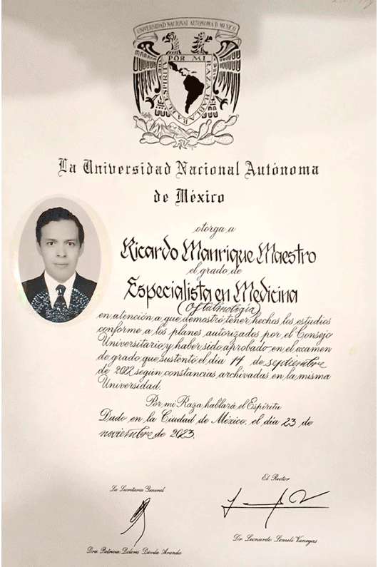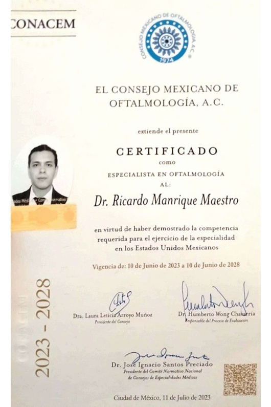 Soy el Dr. Ricardo Manrique Maestro. Realicé la Especialidad en Oftalmología en el Centro Médico Nacional La Raza, en la Ciudad de México, avalada por la UNAM. Estoy certificado por el Consejo Mexicano de Oftalmología y soy miembro de la Sociedad Mexicana de Oftalmología.