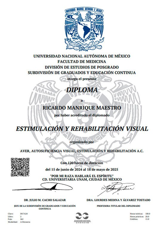 - Diplomado en Visión Baja y Rehabilitación Visual – Fundación AVER, avalado por la Universidad Nacional Autónoma de México (UNAM).