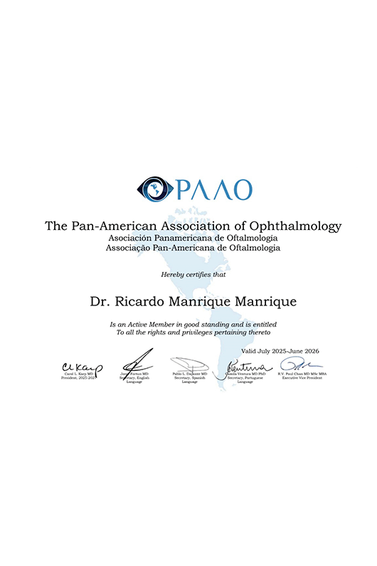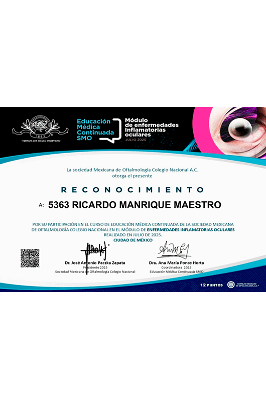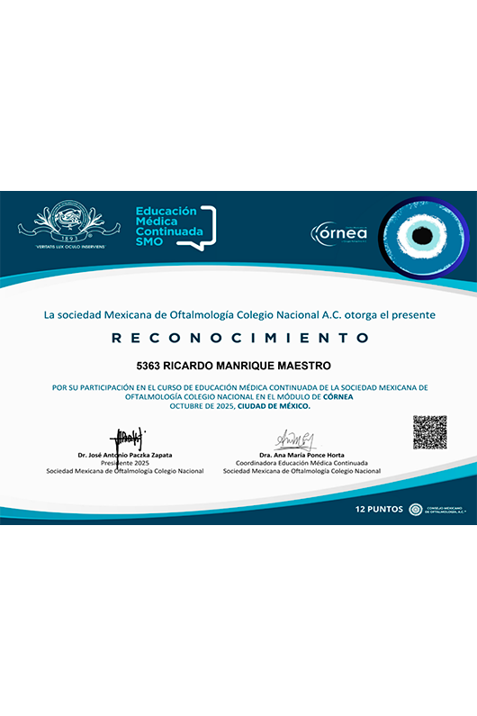 Soy el Dr. Ricardo Manrique Maestro. Realicé la Especialidad en Oftalmología en el Centro Médico Nacional La Raza, en la Ciudad de México, avalada por la UNAM. Estoy certificado por el Consejo Mexicano de Oftalmología y soy miembro de la Sociedad Mexicana de Oftalmología. Me mantengo en constante actualización para ofrecer siempre la mejor atención a mis pacientes.